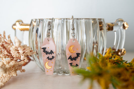 Halloween Earrings - Cute Bat Earrings - Coffin Shaped Earrings - Bat Moon Earrings