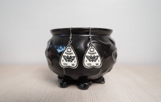 Halloween Earrings - Ouija Planchette Moth Earrings - Wood Planchet Earrings - Paranormal Jewelry - Unique Creepy Earrings
