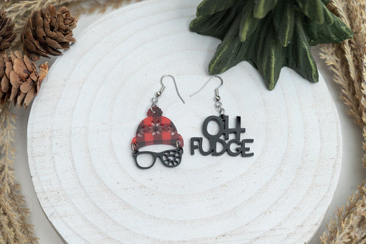 Christmas Story Earrings: Ralphie Buffalo Plaid Hat and Oh Fudge Acrylic Holiday Jewelry