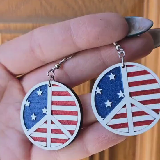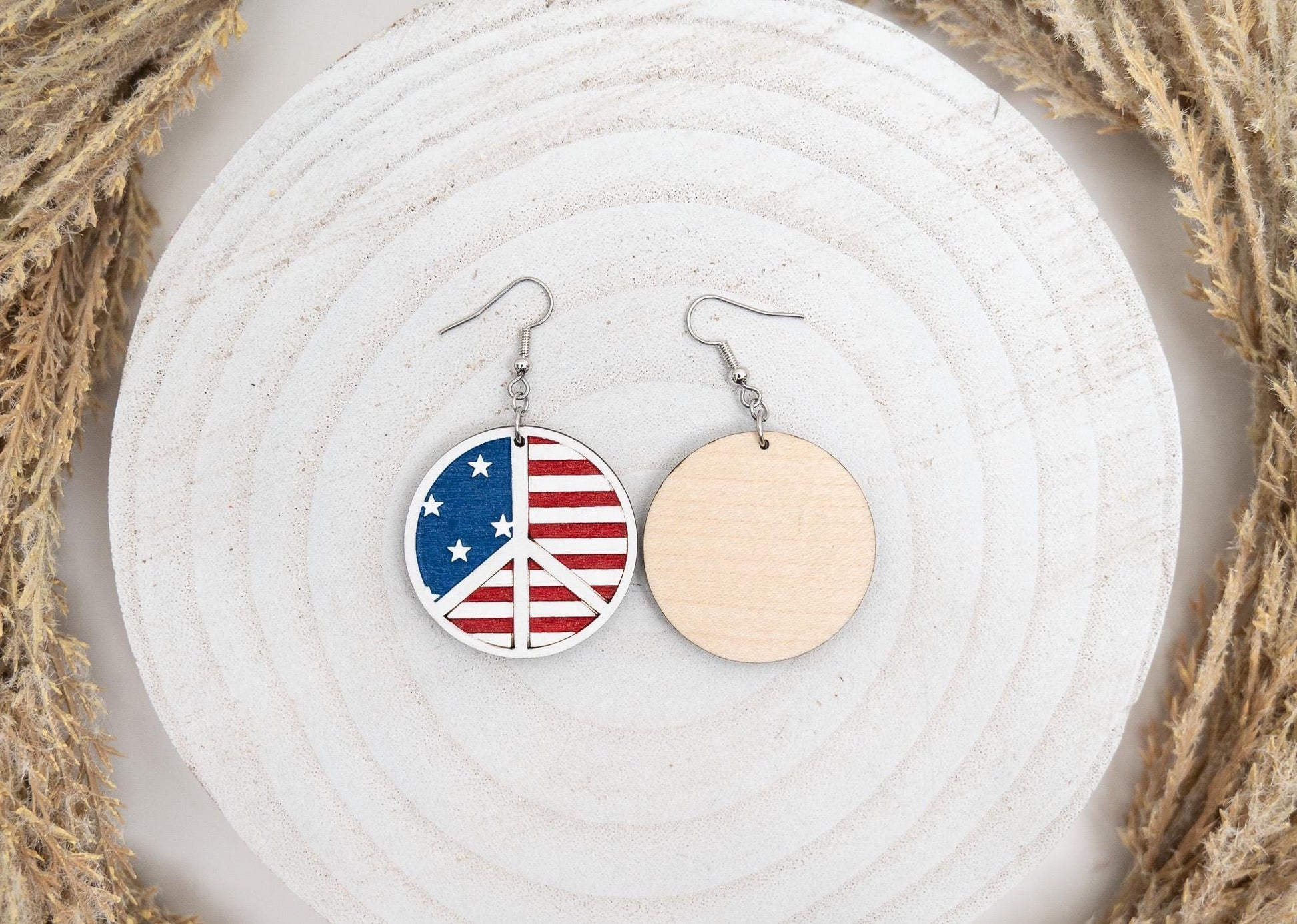 American Flag Peace Sign Earrings: Hand-Painted Wood Patriotic Jewelry