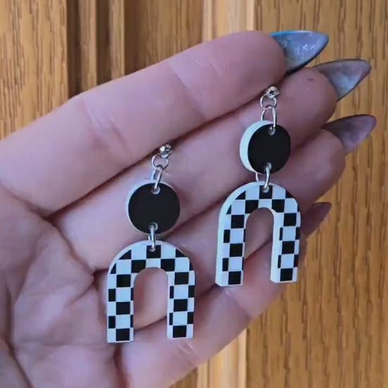 Black & White Checkered Horseshoe Earrings: Boho Acrylic Dangles