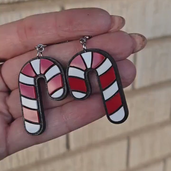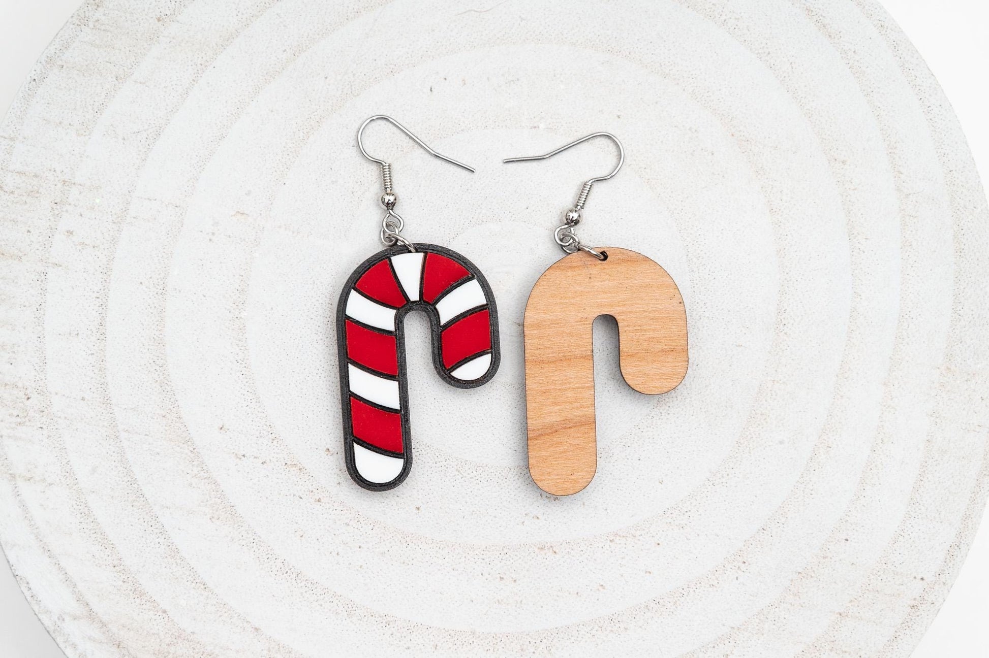 Add a touch of holiday magic to your outfit with these charming Candy Cane layered earrings! Crafted from beautiful Cherry hardwood and layered with 1/16 acrylic, each pair is laser cut, making them a delightful addition to your Christmas wardrobe. These earrings are designed to withstand the festive season and beyond. Perfect for kids and adults, they're the ideal accessory to spread cheer and celebrate the spirit of Christmas!