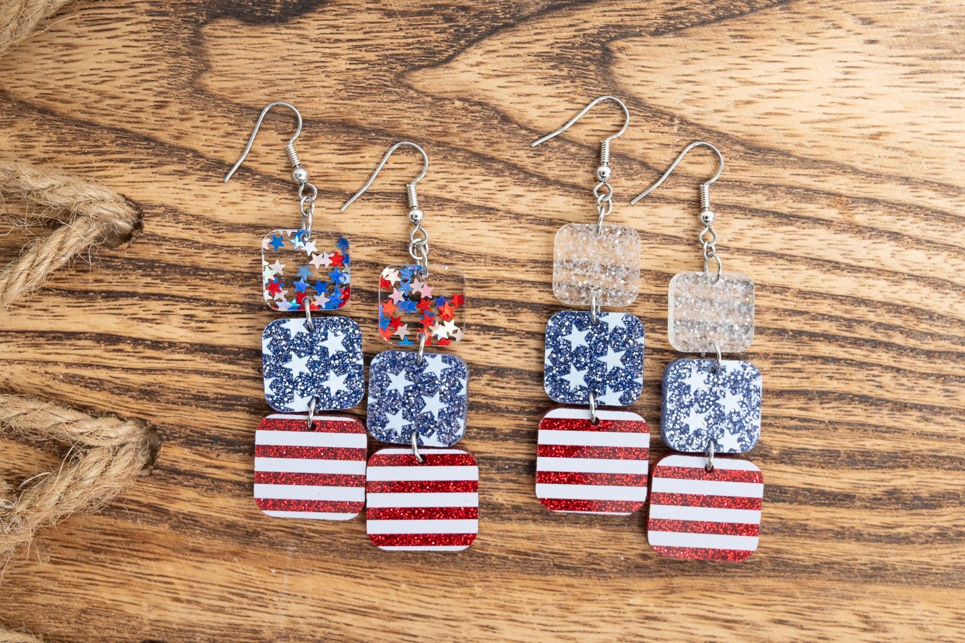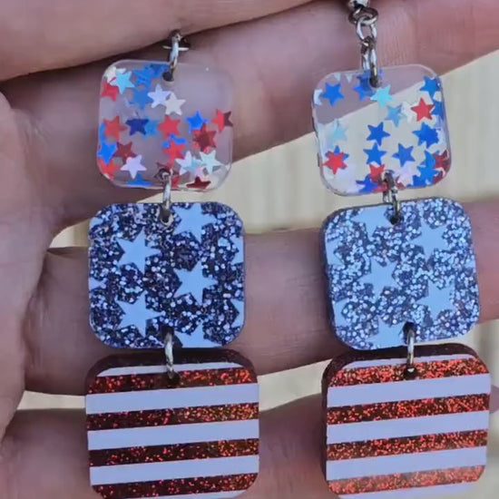 Shine bright with the American spirit! These dazzling dangle earrings feature a vibrant glitter stars and stripes pattern, perfect for celebrating your patriotism all year long. The rounded square design adds a touch of playful charm, while the comfortable 2-inch length and 1/8-inch thickness make them ideal for day-long wear. Add a touch of festive flair to any outfit and show off your American pride with these eye-catching earrings. Watch the video for size reference and different options.