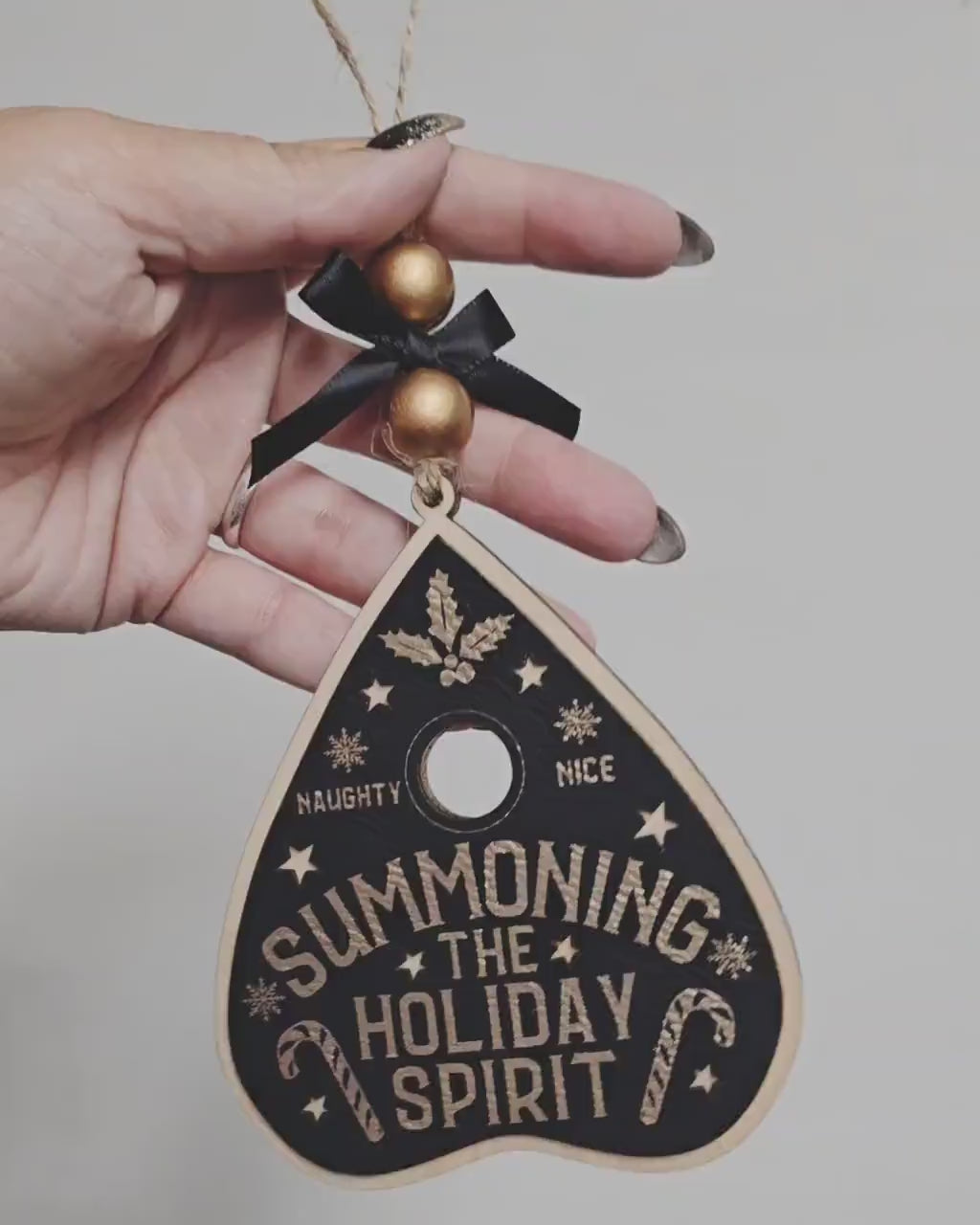 For those who find beauty in the shadows, this gold and black planchette ornament brings a hauntingly elegant touch to your holiday decor. Engraved on black and gold leatherette and glued on birch wood, it's a striking blend of dark mystique and festive charm.